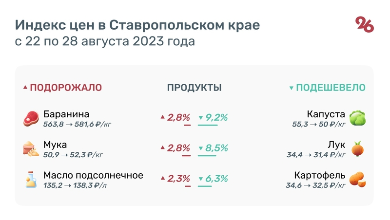 За неделю с 22 по 28 августа в Ставропольском крае на 2,8% подорожала баранина и мука — их стоимость составила 581,6 руб. и 52,3 руб. за кг соответственно. Стоимость подсолнечного масла поднялась на 2,3% — 138,3 руб. за литр, а сливочного на 1,3% — 821 руб. за кг. На 1,8% стали дороже макароны — 120,8 руб. за кг, а на 1,6% вермишель — 110,9 руб. за кг.