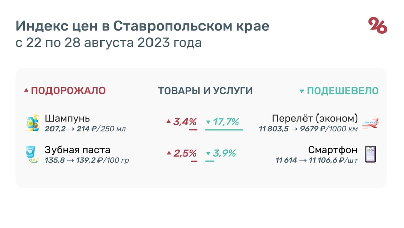 Цена перелётов за неделю упала на 17,7%. Полёт в салоне экономкласса в расчёте на 1 тыс. км пути обойдётся ставропольцам в 9 679 рублей. Смартфоны подешевели почти на 3,9% — 11 106,6 рублей, а поливитамины на 2,1% — 63,5 руб. за 10 шт.