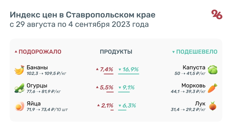 С 29 августа по 4 сентября на Ставрополье на 16,9% подешевела капуста — её цена составила 41,5 руб. за кг. Цена моркови снизилась на 9,1% — 39,3 руб., лука на 6,3% — 29,2 руб., картофеля на 5,8% — 30,6 руб., а яблок на 3,8% — 109,5 руб.