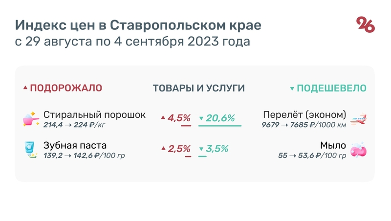 Среди товаров и услуг в период с 29 августа по 4 сентября значительно подешевели авиаперелёты. Цена полёта в салоне экономкласса в расчёте на 1000 км пути упала на 20,6% и составила 7685 рублей.