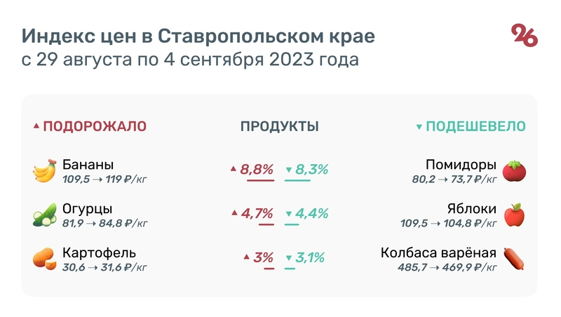 На 8,3% за неделю упала цена помидоров — 73,7 руб. за кг. Яблоки подешевели на 4,4% — 104,8 руб., а на 2% снизилась стоимость капусты, лука и моркови — 40, 28 и 38 руб. за кг соответственно. На 3% доступнее стал килограмм варёной колбасы — 469,9 рублей, а полукопчёные колбасы, напротив, выросли в цене на 1,8% — 611,6 руб. за кг.