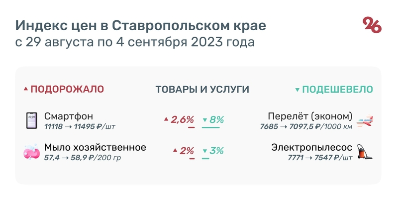 Среди электроники динамику цен показали смартфоны — их стоимость увеличилась на 2,6% — 11 495 руб., а также электропылесосы, которые подешевели на 3% — 7547 руб.