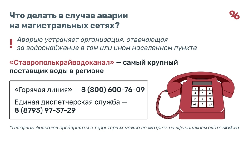 В случае аварии на водопроводе жители края могут обратиться в ГУП СК «Ставрополькрайводоканал» — это крупнейшая в регионе водоснабжающая организация. Горячая линия предприятия: 8 800 600-76-09. Кроме того, звонки принимают по номеру единой диспетчерской службы организации: 8 (8793) 97-37-29.