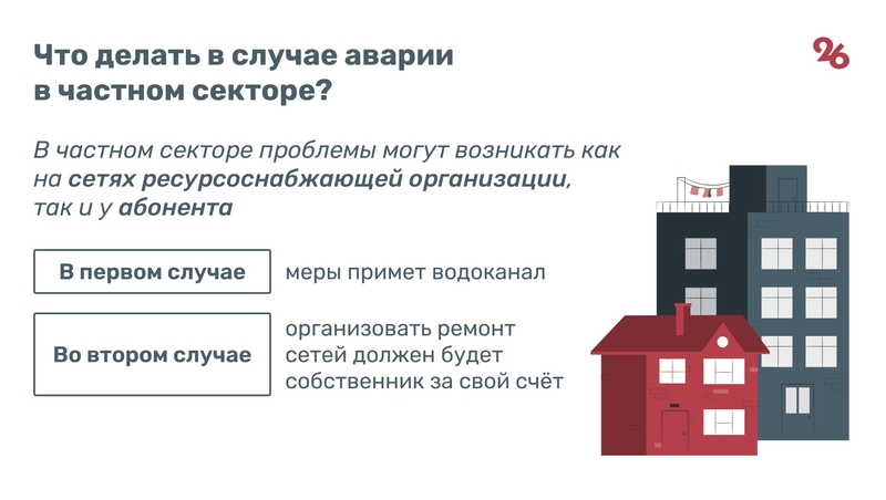 В частном доме авария может возникнуть как у самого собственника, так и на стороне ресурсоснабжающей организации. В первом случае владелец жилища обязан сам оплатить ремонт. Во втором — меры должен принять водоканал.
