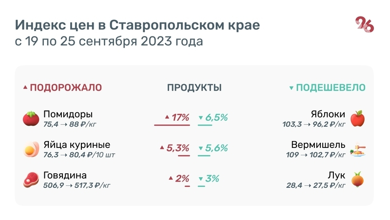 Цена помидоров на Ставрополье достигла 88 рублей — за неделю килограмм овощей стал дороже на 17%. С 19 по 25 сентября на 5,3% увеличилась стоимость яиц — 80,4 руб. за десяток, а на 3,8% выросла цена варёной колбасы — 502,8 руб. за кг. Говядина подорожала на 2% — 517,3 руб. за кг, а творог на 1,8% — 386,4 руб.