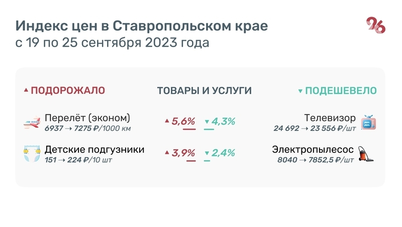 При этом с 19 по 25 сентября в регионе подешевела электроника. Стоимость телевизоров снизилась на 4,3% — 23 556 руб., а электропылесосов на 2,4% — 7852 руб.