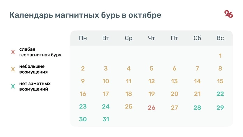 Первая и единственная в этом месяце слабая магнитная буря придёт 26 числа. Затем возмущения пойдут на спад, свидетельствуют данные сервиса my-Calend.