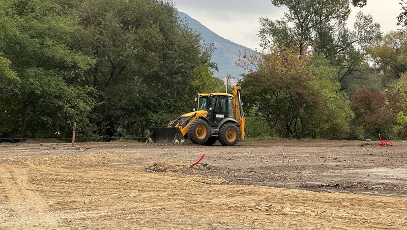 «Подготовлено основание под площадь, укладывается плитка, смонтированы инженерные сети, идёт отсыпка чернозёмом зелёных зон»,