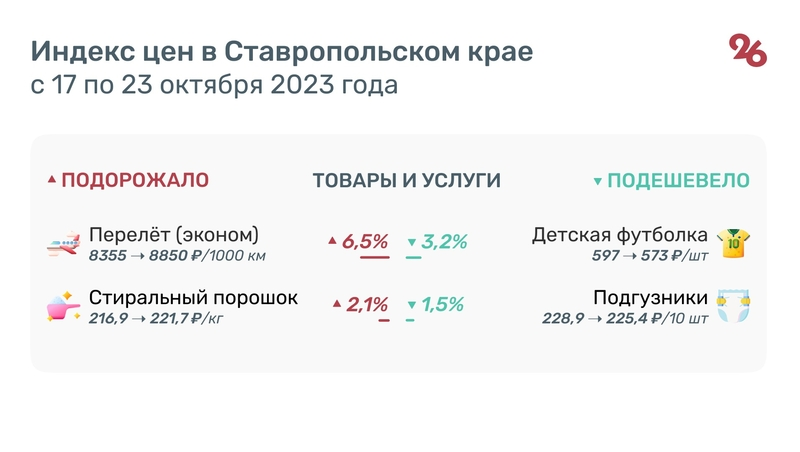 Обратную динамику цен показали детские товары. Футболка для ребёнка подешевела на 3,2% — 573 руб. за шт, а стоимость подгузников снизилась на 1,5% — 225,4 руб. за 10 шт.