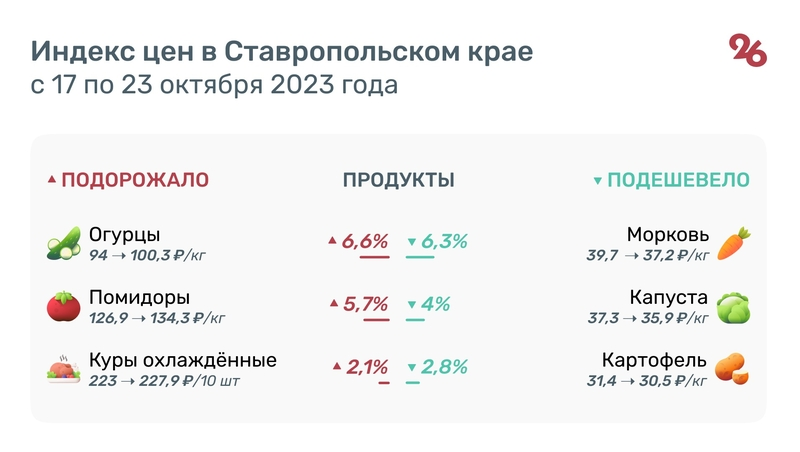 Цена килограмма огурцов за неделю на Ставрополье поднялась до 100,3 руб. Подорожание составило 6,6%. На 5,7% увеличилась стоимость помидоров — 134,3 руб. за кг, на 2% стали дороже яблоки — 97,4 руб., а на 1,6% лук — 31,2 руб.