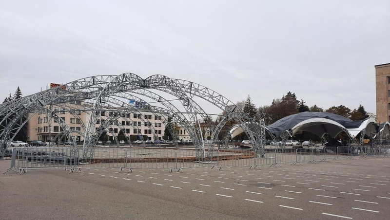 Главный зимний аттракцион продолжают монтировать на площади Ленина краевой столицы. Сейчас рабочие приступили к монтажу тентов, рассчитанных на обильные снегопады и крепкий ветер.