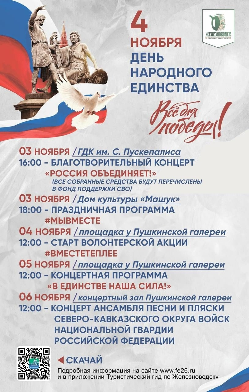Кроме того, по программе праздничных мероприятий в Железноводске пройдут концерты 3, 5 и 6 ноября.