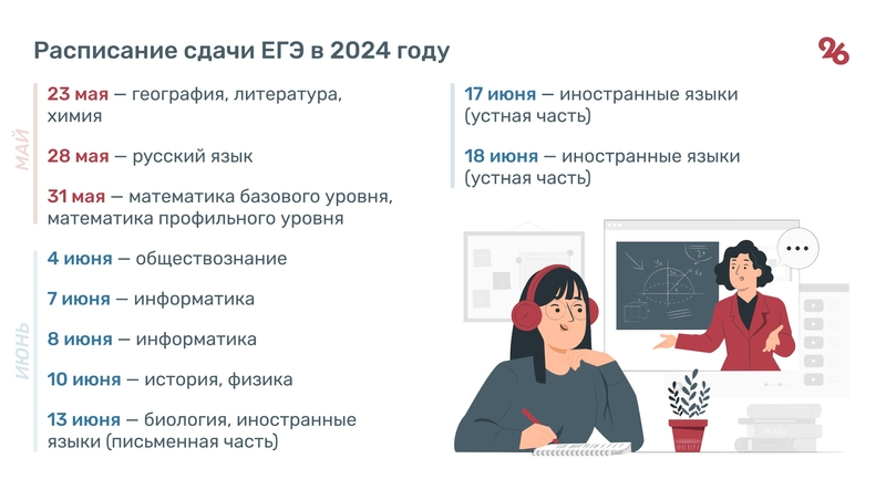 Основной период сдачи ЕГЭ в 2024 году начнётся 23 мая и закончится 1 июля. Досрочный начнётся на месяц раньше — с 22 марта. Подробное расписание смотрите на инфографике «Победы26».