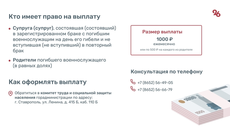 В 2023 году появилась новая мера соцподдержки семей участников СВО — выплата на проезд в городском общественном транспорте. На её получение имеют право супруга (супруг) и родители погибшего военнослужащего. Сумма выплаты — 1 тыс. рублей ежемесячно, либо по 500 рублей на каждого родителя.