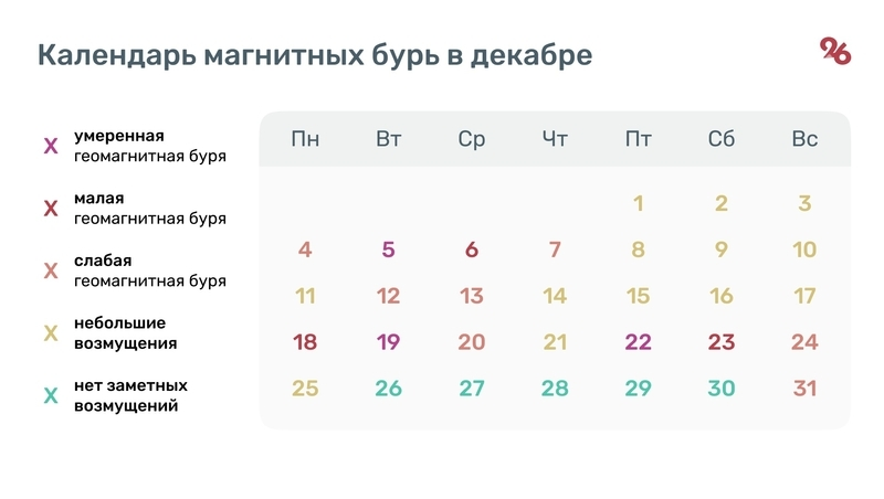 В последнюю неделю года заметных возмущений не прогнозируют, за исключением 31 декабря. В этот день ожидается слабая магнитная буря.