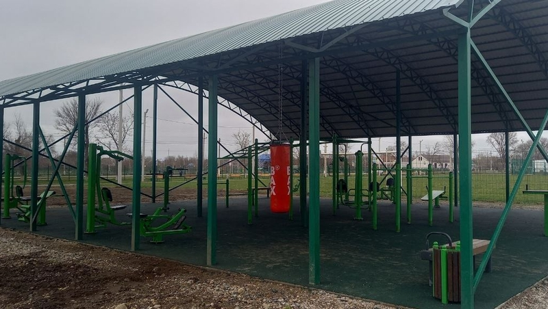 На площадке появились тренажёры, боксёрская груша, места для отдыха. Всё это снабжено освещением и находится под навесом.