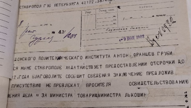 «Названное Министерство по соглашению с Министерством торговли и промышленности и Военным Министерством признало возможным предоставить слушателю Донского политехнического института Антону Груби отсрочку по исполнению воинской повинности до призыва 1912 года»,