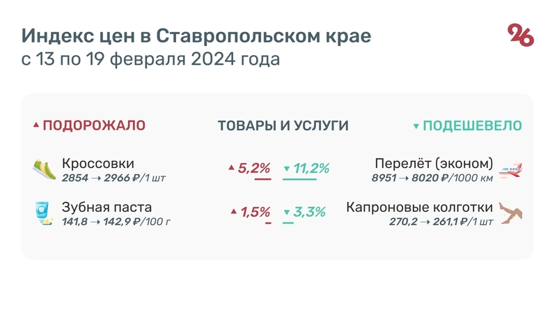 Среди непродовольственных товаров и услуг подорожала одежда. Кроссовки для взрослых выросли в цене на 5,2% — 2965 руб., детская футболка на 2,3% — 579,7 руб., школьные брюки на 2% — 2276 руб. При этом женские капроновые колготки стали дешевле на 3,3% — 261 руб.