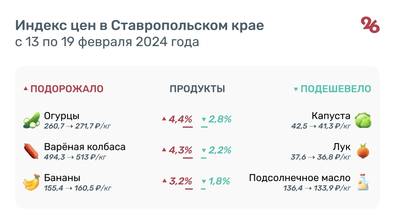 На 4,3% в Ставропольском крае подорожала варёная колбаса. Её цена составила 513 руб. за кг. На 1,1% выросла цена сосисок и сарделек — 475 рублей.