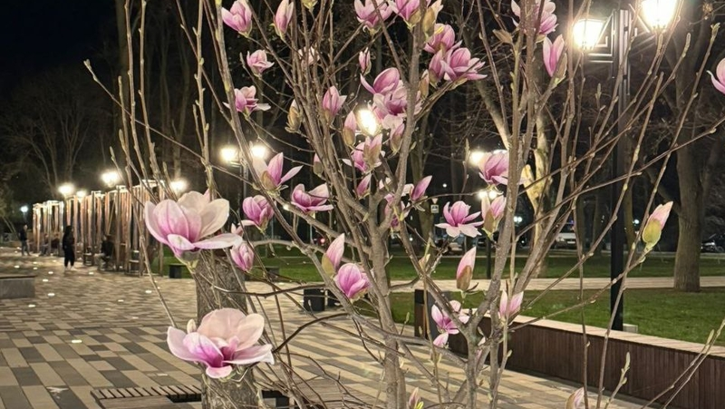 Магнолии благополучно пережили уже вторую зиму и зацвели с приходом тепла в сквере по улице Маяковского.