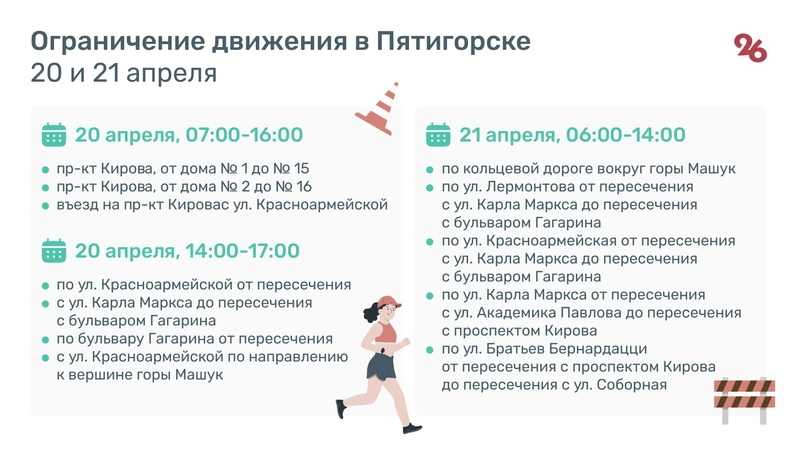Пятигорский полумарафон KAVKAZ.RUN пройдёт на ставропольском курорте 20 апреля. На время проведения забега часть дорог закроют для транспорта.