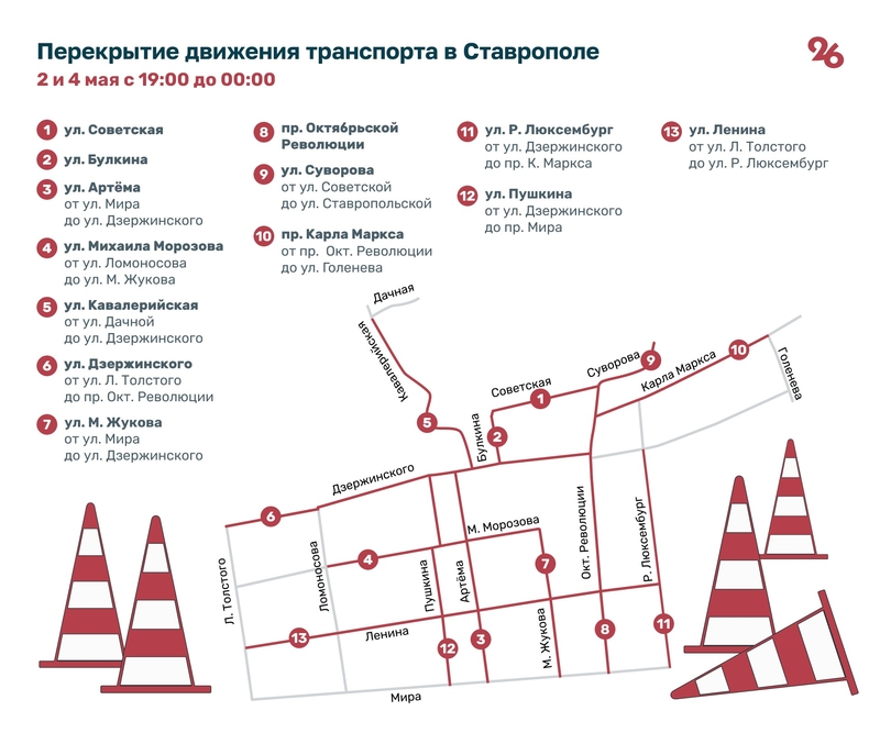Кроме того, 7 мая с 9:00 до 13:00 перекроют движение дополнительно по улице Казачьей (от Горького до Орджоникидзе), переулку Рылеева (от Орджоникидзе до К. Маркса), К. Маркса (от Голенева до Войтика).