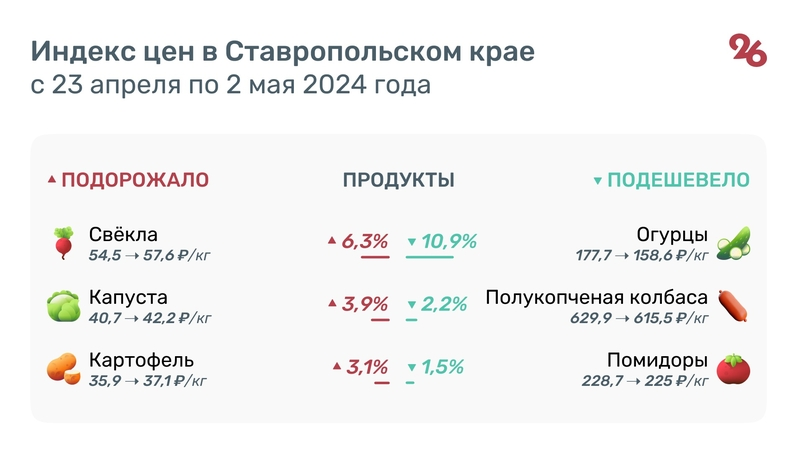 С 23 апреля по 2 мая на Ставрополье на 6,3% выросла цена свёклы — 57,6 руб. за кг. На 3,9% в регионе подорожала капуста — 42,2 руб. за кг, на 3,1% картофель — 37,1 руб. за кг, на 2,8% морковь — 47 руб. за кг и на 2,2% лук — 39,8 руб. за кг.
