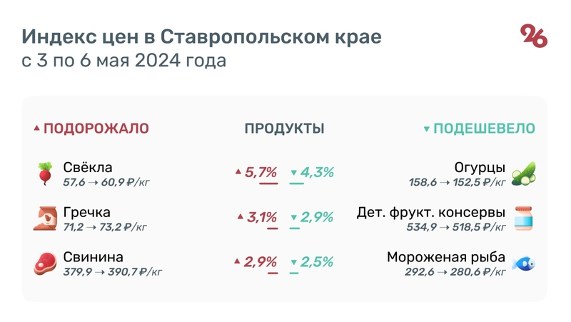 Цена гречки поднялась на 3,1% — 73,2 руб. за кг. Яблоки на Ставрополье подорожали на 2,3% — 123,8 руб. за кг. Фруктовые детские консервы стали дешевле почти на 3% — 518,5 руб. за кг, а стоимость молочных смесей снизилась на 1,5% — 1041,6 руб. за кг.