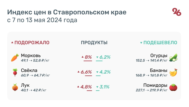 За неделю на Ставрополье на 8% подорожала морковь — 52,8 руб. за кг, на 6,3% выросла цена свёклы — 64,7 руб. за кг, на 4,8% лука — 42 руб. за кг, на 4% капусты — 43,5 руб. за кг, а на 2,7% картофеля — 38,7 руб. за кг.
