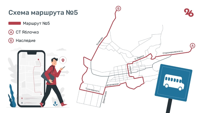 Конечные остановки маршрута №5 — СТ «Яблочко» и школа зимних видов спорта «Наследие». Автобусы будут ходить по улицам Восточной, Старомарьевскому шоссе, Апанасенковской, Вокзальной, проспектам Карла Маркса и Октябрьской Революции, улицам Советской, Булкина, Дзержинского, Артёма, Партизанской, проезду Черняховского, Серова, переулку Баумана, улицам Горной, Мичурина, Куйбышева, Абрамовой, Льва Толстого, Матросова, Шпаковской, Доваторцев, Тухачевского, проспекту Российскому, улицам Западный обход, Ленина, Индустриальной, 1-й Промышленной и проспекту Кулакова.