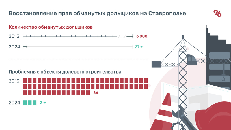 Десять лет назад на Ставрополье насчитывалось 6 тыс. обманутых дольщиков и 66 проблемных объектов. И по поручению губернатора региона решением этого вопроса и помощью людям занимался краевой минстрой.