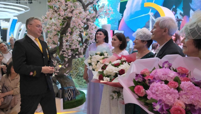 На стенде Ставрополья на выставке «Россия» в Москве две пары из края отпраздновали годовщины свадеб: Надежда и Владимир Подорога вместе уже 55 лет, Ольга и Александр Белоносовы — 50 лет.