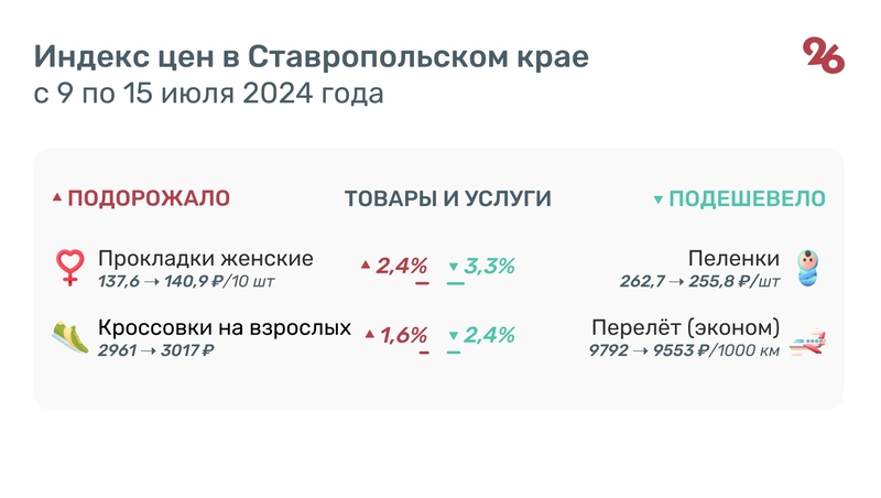 Пелёнки для новорождённых подешевели на 3,3% — 255,8 руб. за шт. Цена авиаперелётов за неделю снизилась на 2,4%. Полёт в салоне экономкласса обойдётся в 9553 рубля в расчёте на 1000 км пути.