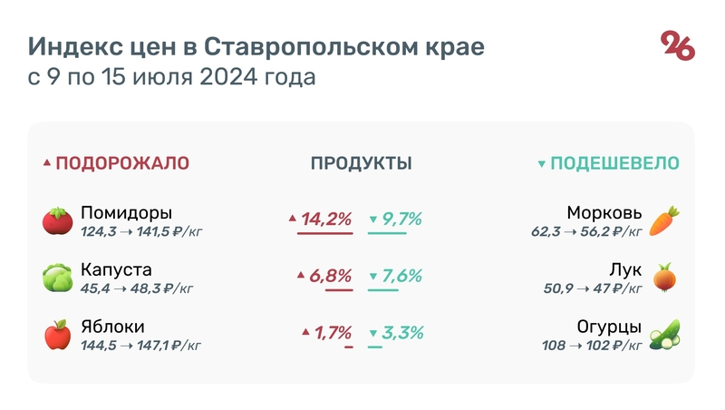 За неделю в Ставропольском крае на 14,2% подорожали помидоры, их цена составила 141,5 руб. за кг. Цена капусты поднялась на 6,8% — 48,3 руб. за кг, а яблок на 1,7% — 147,1 руб. за кг.