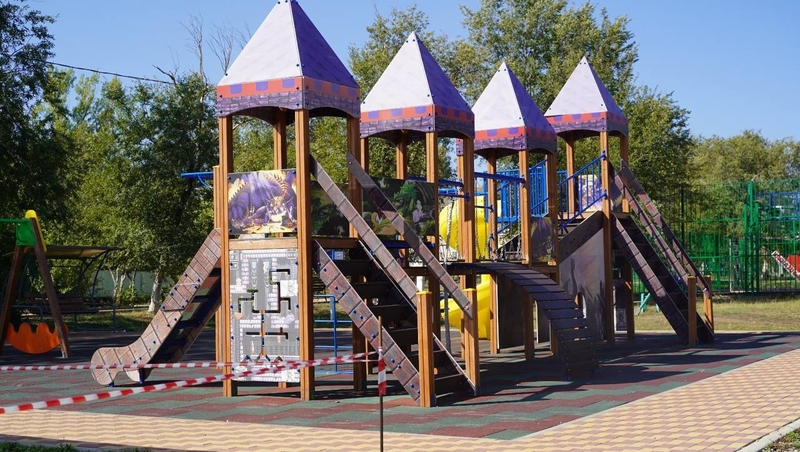 Рабочие установили спортивные тренажёры, каркас, навес и уложили специальное покрытие на пол. Также на территории есть детская зона с качелями.