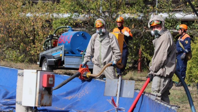 После тушения возгорания участники выстроили подпорную стенку, чтобы не допустить дальнейший разлив мазута, и распылили сорбент на загрязнённые участки. Последним пунктом действий стал сбор мазута в специальные ёмкости.