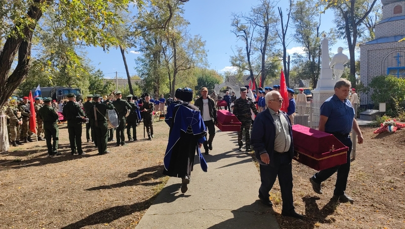 В сквере хутора Дыдымкина состоялся траурный митинг, останки 25 бойцов Красной армии опустили в братскую могилу.