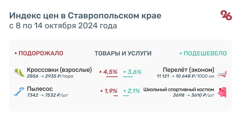 Среди непродовольственных товаров и услуг на 4,5% подорожали кроссовки на взрослых — 2935 руб. за пару, а на 2,1% — детские — 2255 руб. Джинсы на детей выросли в цене на 1,8% — 2459 руб. При этом спортивные костюмы на школьников подешевели на 2,1% — 3611 руб.