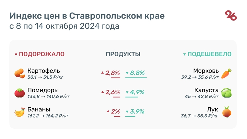 По данным еженедельного мониторинга Северо-Кавказстата, за неделю цена килограмма картофеля на Ставрополье поднялась ещё на 2,8% — 51,5 руб. Помидоры подорожали на 2,5% — 140,6 руб. за кг, а бананы на 2% — 164,2 руб. за кг. На 1,5% поднялась стоимость пшеничной муки — 53,7 руб. за кг.