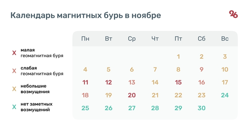 Согласно прогнозу, геомагнитное поле стабилизируется 24 ноября. Подробнее о том, как подобные события влияют на людей, читайте в большом материале «Победы26».