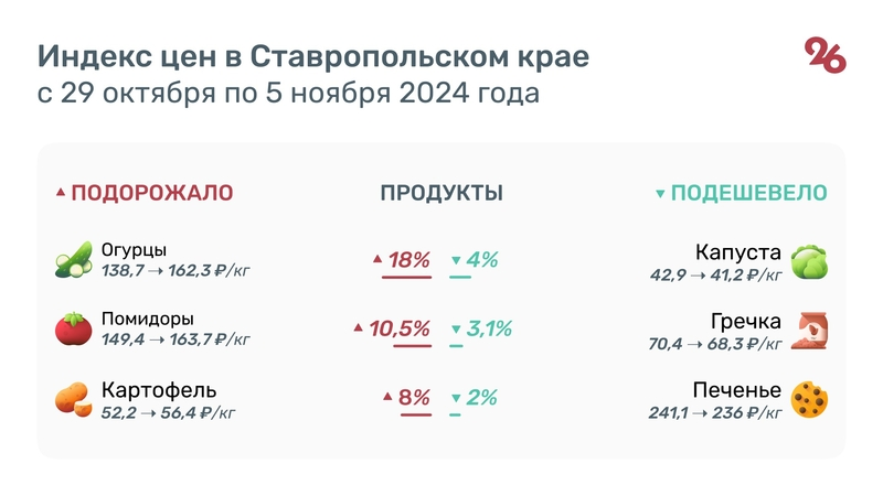 За неделю в Ставропольском крае на 18% подорожали огурцы — 162,3 руб. за кг. Помидоры выросли в цене на 10,5% — 163,7 руб. за кг.
