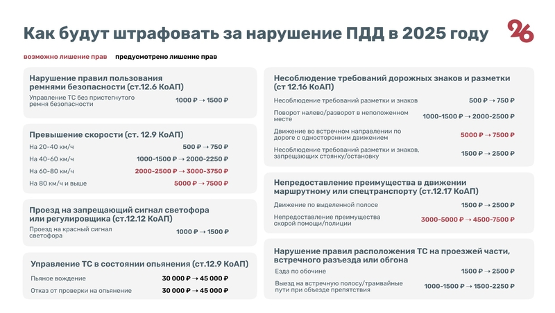 По некоторым категориям штрафы возрастут до 7,5 тыс. рублей. А за пьяную езду автолюбителям придётся заплатить 45 тыс. рублей. Подробности — в инфографике «Победы26».