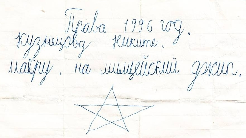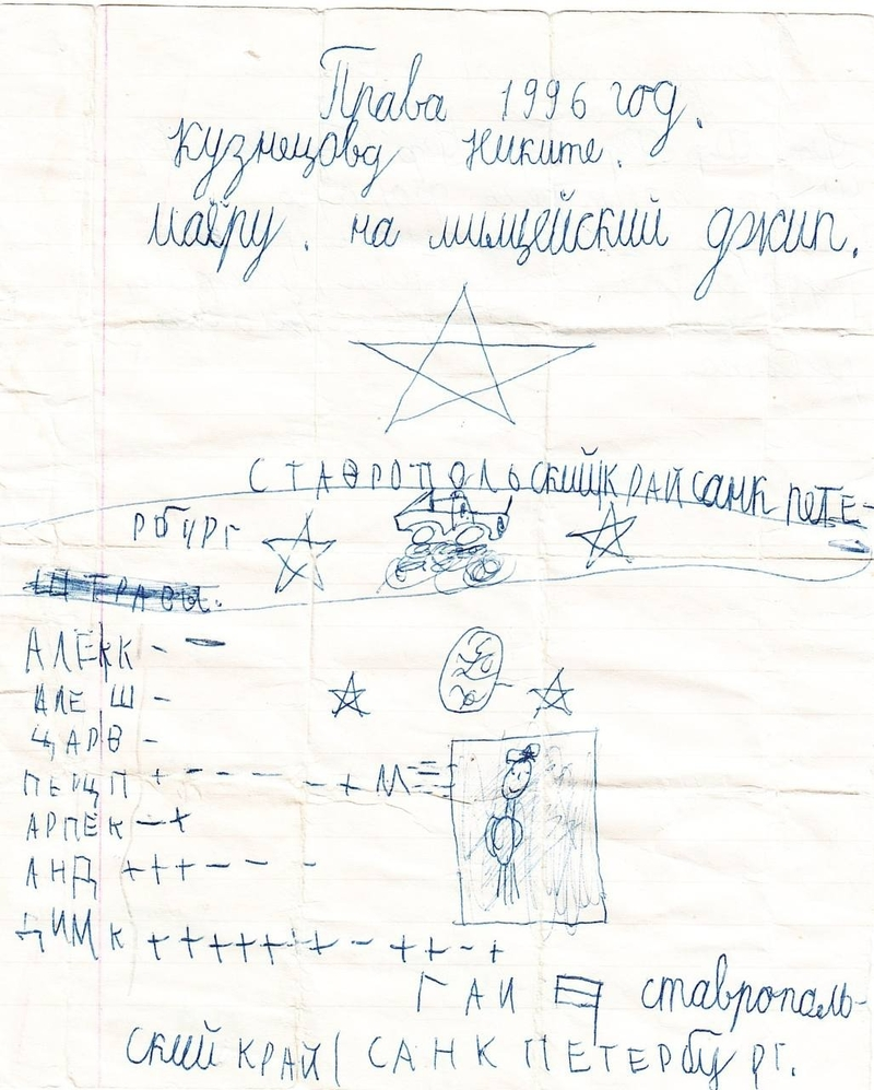 На игрушечных водительских правах «на милицейский джип» написаны фамилия и имя автора, а также место их «выдачи».