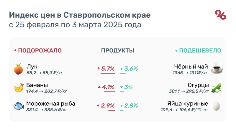 На 5,7% за неделю в Ставропольском крае подорожал лук. Килограмм этого овоща теперь можно купить по цене 58,3 руб. На 4,1% в регионе выросла стоимость бананов — 202,7 руб. за кг. Мороженая рыба стала дороже на 2,9% — с 331,4 до 338,6 руб. за кг.
