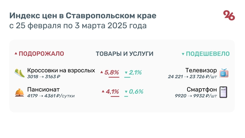 Среди непродовольственных товаров и услуг на 5,8% подорожали кроссовки для взрослых — 3163 руб. за пару. Суточное пребывание в пансионате выросло в цене на 4,1% — 4361 руб.