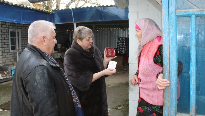 Заместитель главы Степновского округа Ирина Тупица совместно с председателем Совета ветеранов Геннадием Ширшиком вручили памятные награды — юбилейные медали в честь Великой Победы.