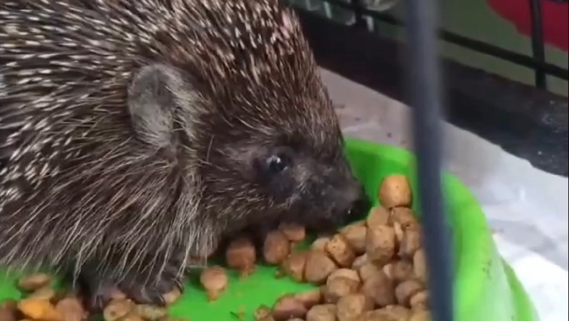 Ежа нашли 15 февраля на трассе. Он был настолько слаб, что не мог стоять. В приюте его подкармливали, определили в клетку. Сейчас ёжик чувствует себя лучше.