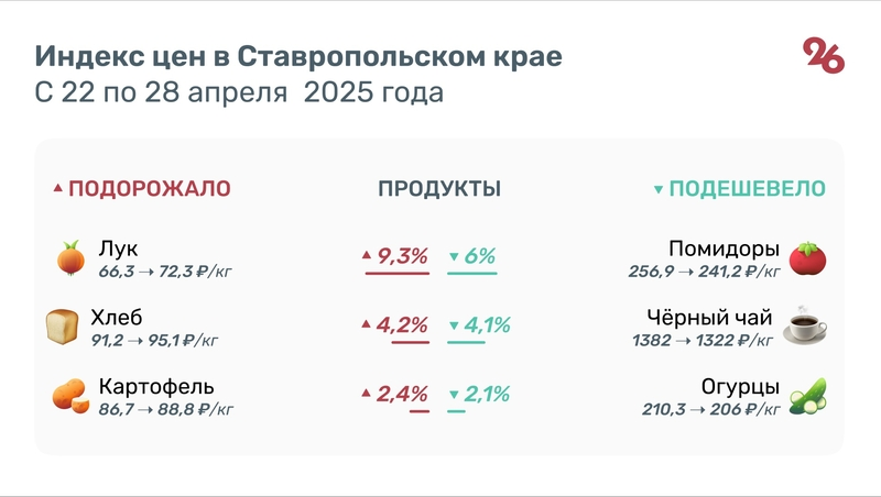 С 22 по 28 апреля в Ставропольском крае на 9,3% увеличилась стоимость лука — с 66,3 до 72,3 руб. за кг. Цена хлеба выросла на 4,2%: с 91,2 до 95,1 руб. за кг, а картофеля — на 2,4%: с 86,7 до 88,8 руб. за кг.