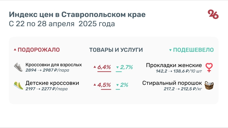 Среди непродовольственных товаров и услуг в Ставропольском крае на 6,4% подорожали кроссовки для взрослых — с 2894 до 2987 руб., а детская обувь выросла в цене на 4,5%: с 2197 до 2277 руб.