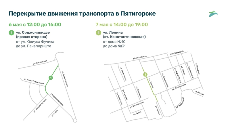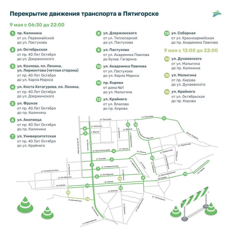 Весь день пятницы, 9 мая, с 6:00 до 22:00 будут закрыты 14 участков улиц Пятигорска, а с 12:00 до 22:00 — ещё три участка.